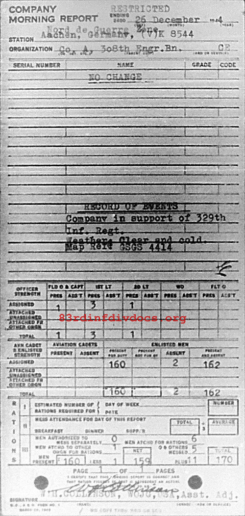 Company in support of 329th Inf. Regt. Weather: Clear and cold.