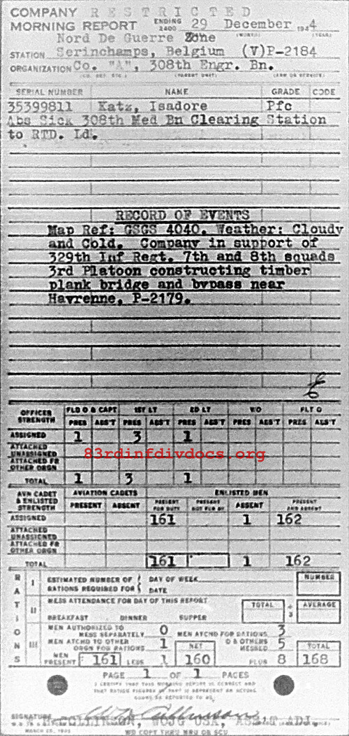 Weather: Cloudy and cold. Company in support of 329th Inf Rest, 7th and 8th squads, 3rd Platoon constructing timber plank bridge and bypass near Havrenne, P-2179.