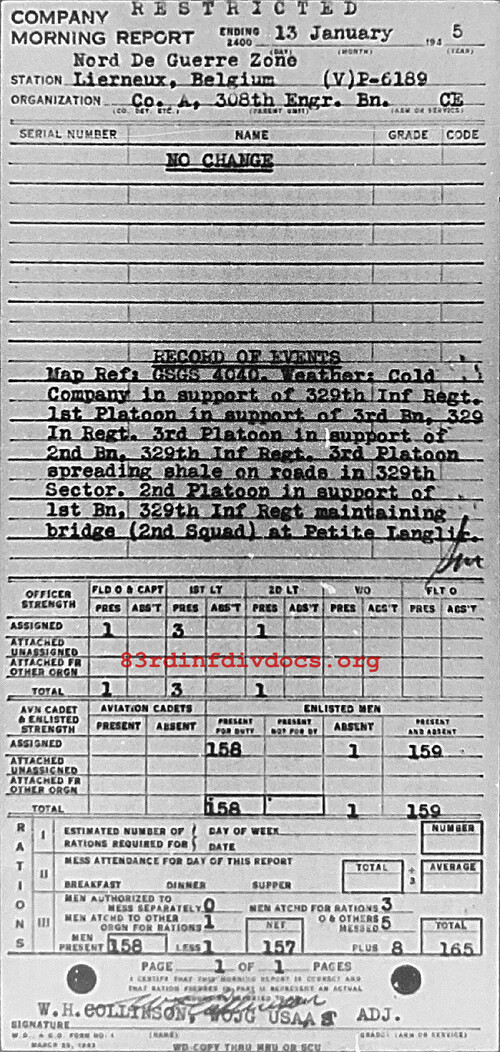 Weather: Cold. Company in support of 329th Inf Regt. 1st Platoon in support of 3rd Bn, 329th Inf Regt. 3rd Platoon in support of 2nd Bn, 329th Inf Regt. 3rd Platoon spreading shale on roads in 329th Sector. 2n Platoon in support of 1st Bn, 329th Inf Regt maintaining bridge (2nd Squad) at Petite-Langlir.