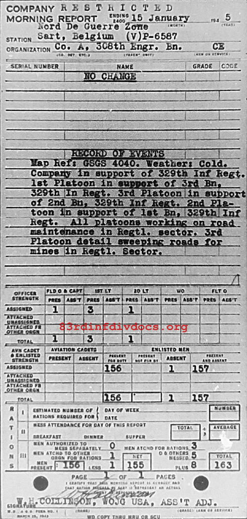 Weather: Cold. Company in support of 329th Inf Regt. 1st Platoon in support of 3rd Bn, 329th Inf Regt. 3rd Platoon in support of 2nd Bn, 329th Inf Regt. 2nd Platoon in support of 1st Bn, 329th Inf Regt. All platoons working on road maintenance in Regtl. sector. 3rd Platoon detail sweeping roads for mines in Regtl. Sector