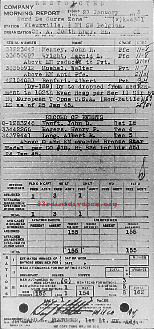 O-1283248 Haft, John D. 1st Lt, 33442266 Rogers, Henry P. Tec 4, 34379441 Long, Albert R. Tec 5. Above O and EM awarded Bronze Star Medal per GO #10, Hq 83d Inf Div dtd 24 Jan 45.