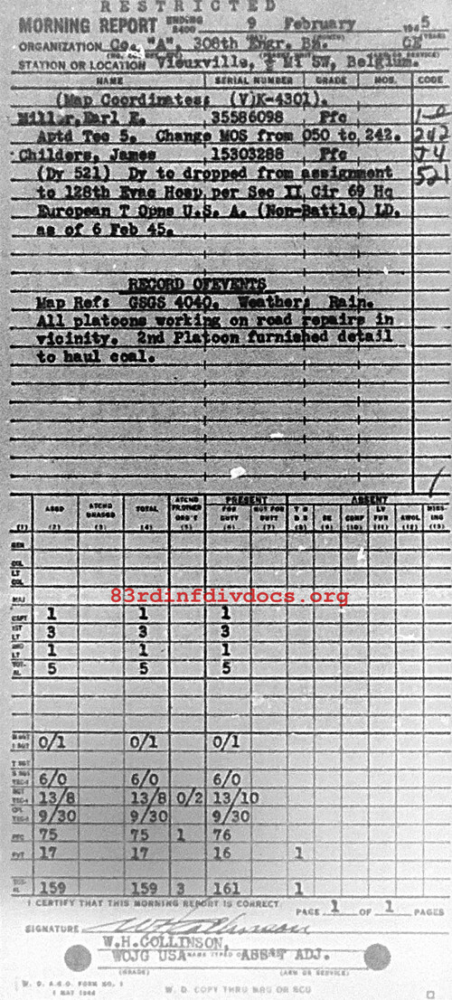 Morning report A/308E for February 9, 1945