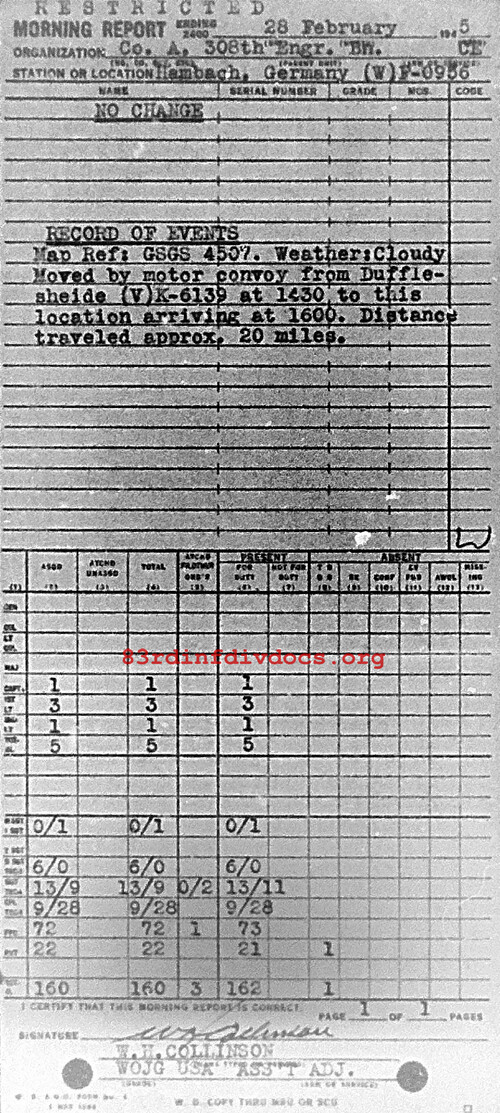 Weather: Cloudy. Moved by motor convoy from Duffiescheide, vK6139 at 1430, this location arriving at 1600. Distance traveled: Approximately 20 miles.