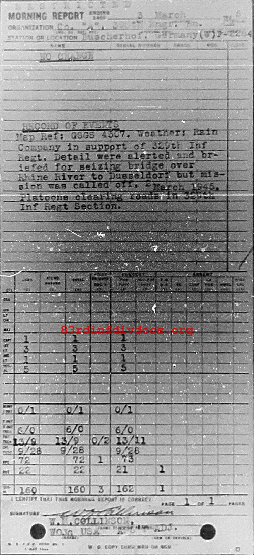 Weather: Rain. Company in support of 329th Inf Regt. Detail were alerted and briefed for seizing bridge over Rhine River to Dusseldorf but mission was called off, 2 March 1945. Platoons clearing roads roads in 329th Inf Section.