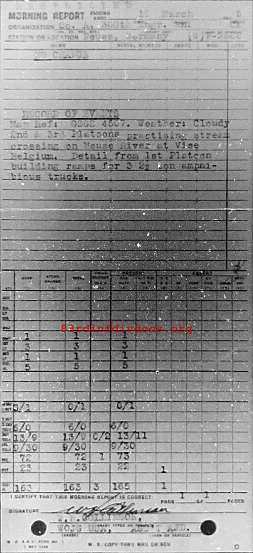 Weather: Cloudy. 2nd and 3rd Platoons practising stream crossing on Meuse River at Vise Belgium. Detail from 1st Platoon building ramps for 3 2 1/2 ton amphibious trucks.