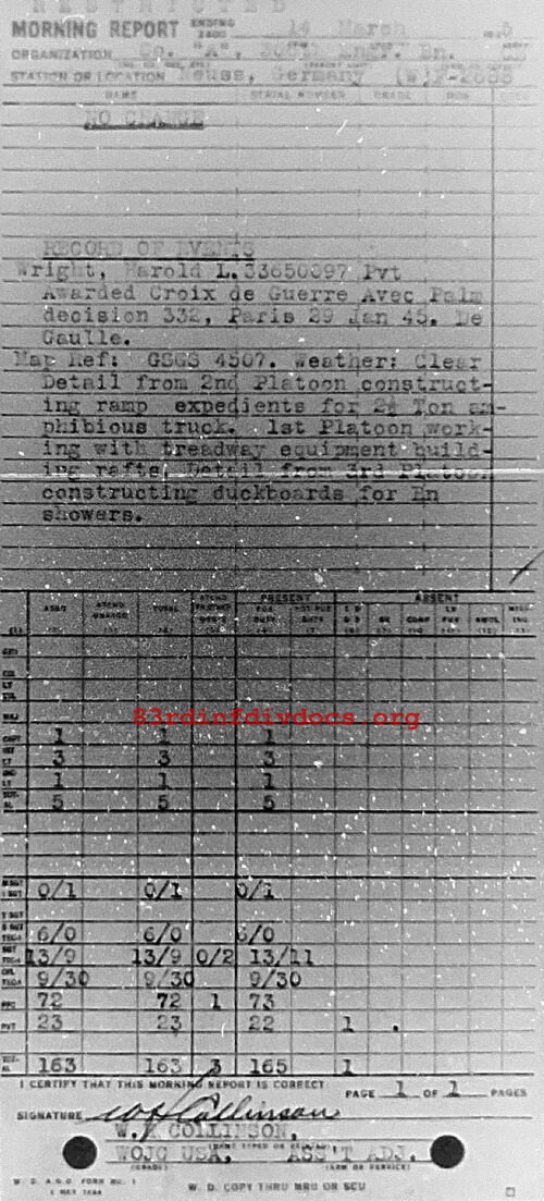 Wright, Harold L, 33650097 Pvt, Awarded Croix de Guerre Avec Palm decision 332, Paris, 29 Jan 45. De Gaulle. Weather: Clear. Detail from 2nd Platoon constructing ramp expedients for 2 1/2 ton amphibious truck. 1st Platoon working with treadway equipment building rafts. Detail from 3rd Platoon constructing duckboards for Bn showers.