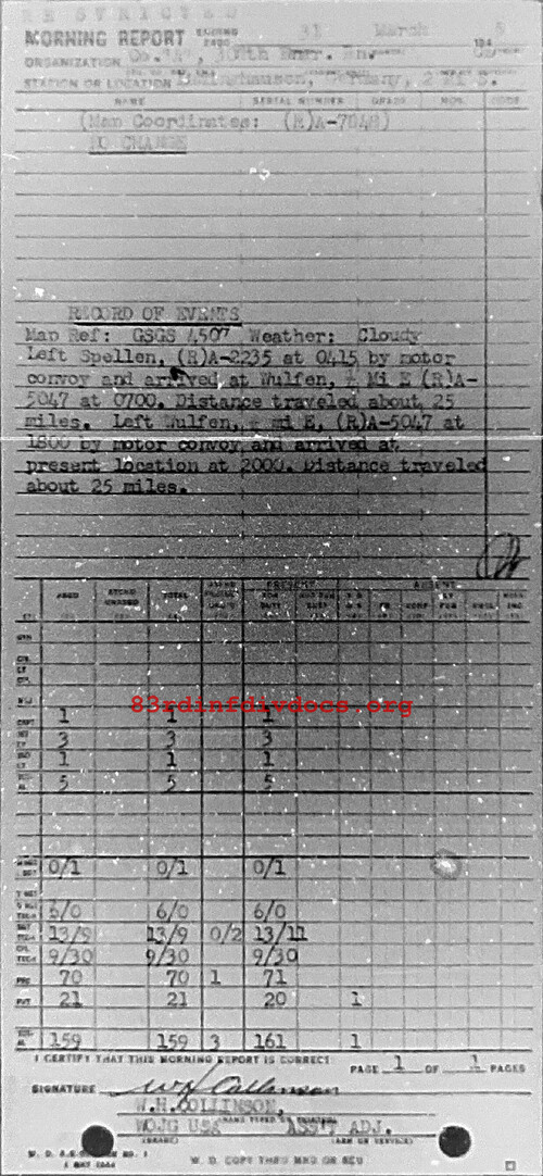 Record of events: Weather: Cloudy. Left Spellen, rA2235 at 0415 by motor convoy and arrived at Wulfen, 1/4 Mi E rA5047 at 0700. Distance traveled about 25 miles. Left Wulfen, 1/4 mi E, rA5047 at 1800 by motor convoy and arrived at present location at 0200. Distance traveled 25 miles.