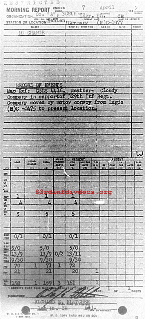 Weather: Cloudy. Company in support of 329th Inf Regt. Company moved by motor convoy from Lugde, rC0475 to present location.