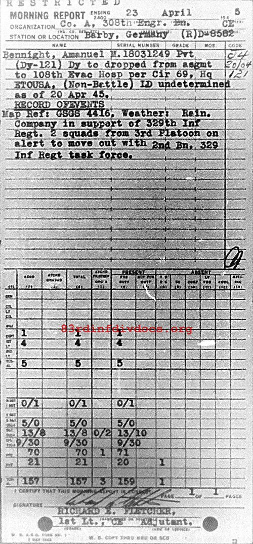 Weather: Rain. Company in support of 329th Inf Regt. 2 squads from 3rd Platoon on alert to move out with 2nd Bn, 329th Inf Regt task force.