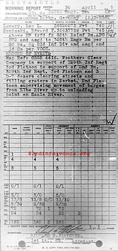 Weather: Clear. Company in support of 329th Inf Regt. 3rd Platoon in support of 2nd Bn, 329th Inf Regt. 3rd Platoon and 3 D-7 dozers clearing streets and filling craters in Zerbst. 2nd Platoon supervising movement of barges from Elbe River up to unloading point on Saale River.