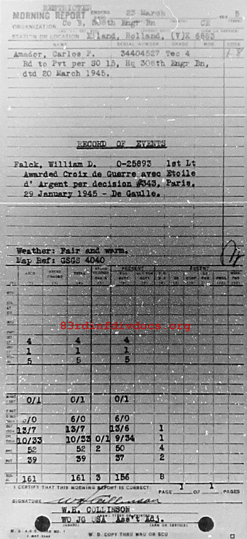 Falck, William D. O-25893, 1st Lt. Awarded Croix de Guerre avec Etoile d'Argent per decision #343, Paris, 29 January 1945 - De Gaulle. Weather: Fair and warm