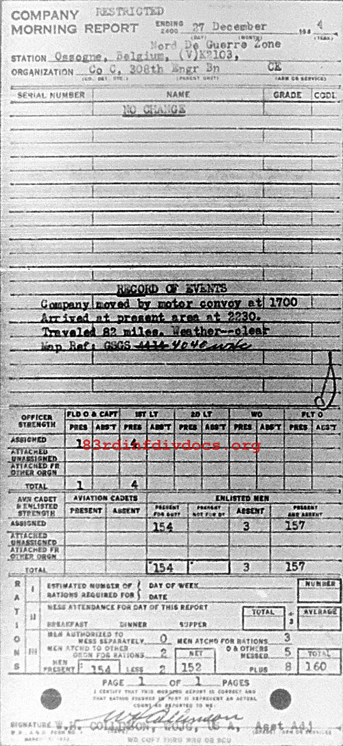 Company moved by motor convoy at 1700. Arrived at present area at 2230. Traveled 82 miles. Weather: Clear.