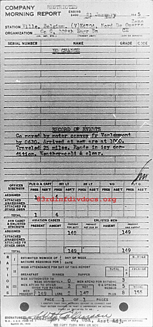 Co moved by motor convoy fr Verleumont by 0630. Arrived at new area at 1000. Traveled 25 miles. Roads in icy condition. Weather: Cold and clear.