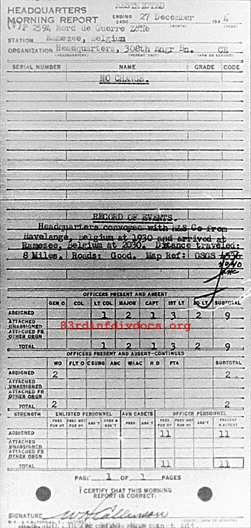 Headquarters convoy with H&S Co from Havelange, Belgium at 1930 and arrived at Ramezee, Belgium at 2030. Distance traveled: 8 miles.