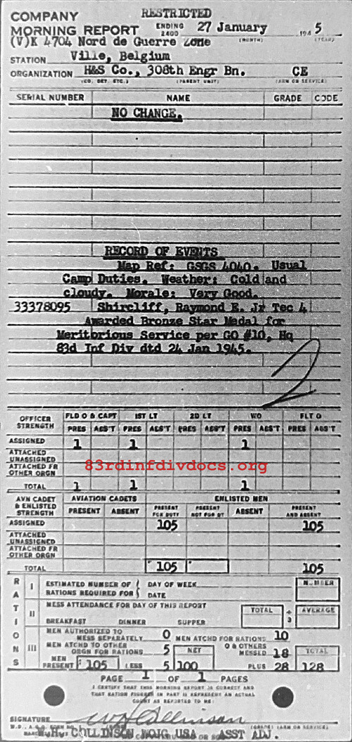 Usual Camp Duties. Weather: Cold and cloudy. Morale: Very good. 33378095 Shircliff, Raymond E, Jr, Tec4. Awarded Bronze Star Medal for Meritorious Service per GO #10, Hq 83d Inf Div dtd 24 Jan 1945.