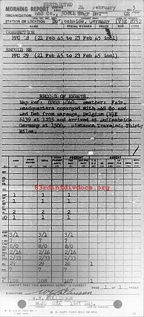 Morning report HQSVCO/308E for February 24, 1945