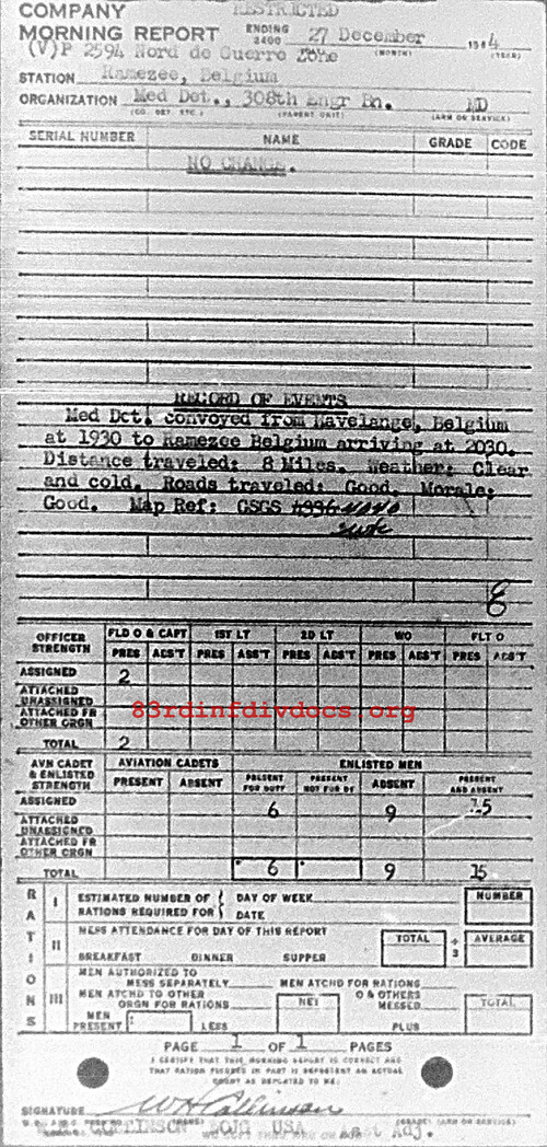 Med Det. convoyed from Havelange, Belgium at 1930 to Ramezee, Belgium arriving at 2030. Distance traveled: 8 miles. Weather: Clear and cold. Roads traveled: Good. Morale: Good.