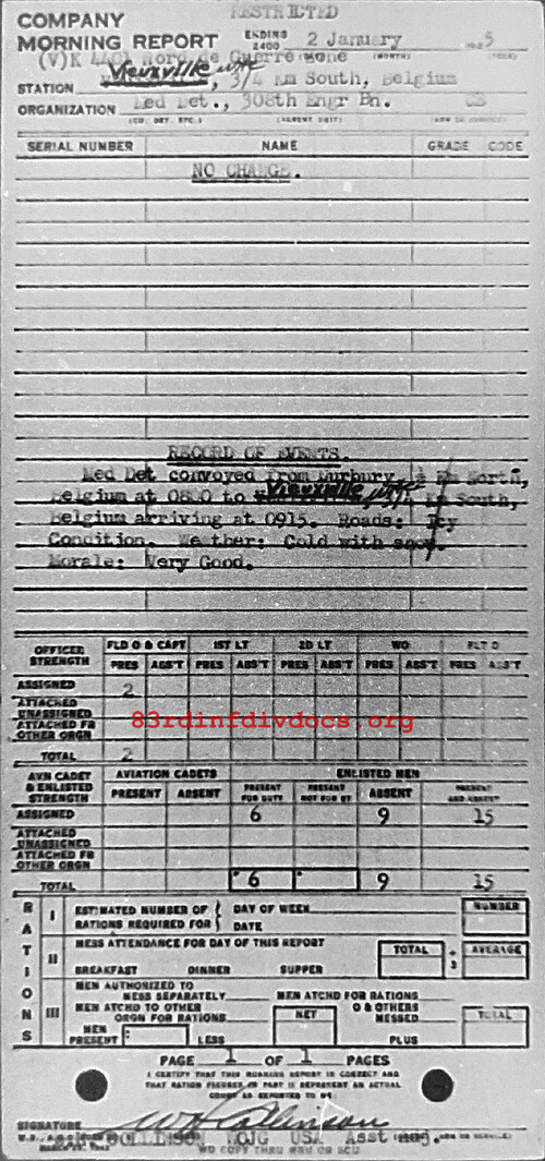 Med Det convoyed from Durbury, 1/2 Km North, Belgium at 0800 to Vieuxville, 3/4 Km South, Belgium arriving at 0915. Roads: Icy condition. Weather: Cold with snow. Morale: Very good.