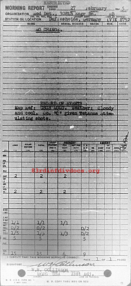 Weather: Cloudy and cool. Co 'C' given Tetanus stimulating shorts.
