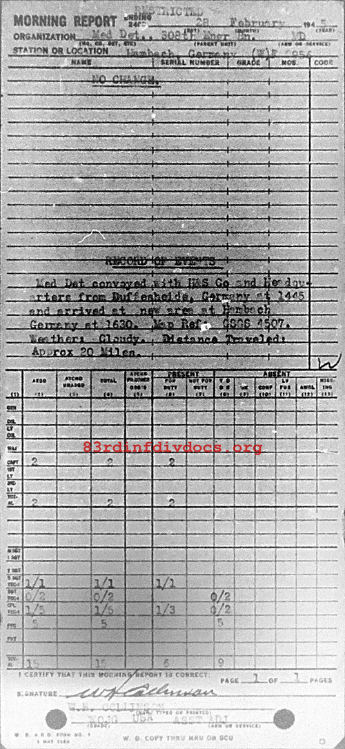 Med Det convoyed with H&S Co and Headquarters from Duffesheide, Germany at 1445 and arrived at new area at Hambach, Germany at 1630. Weather: Cloudy. Distance traveled: Approximately 20 miles.