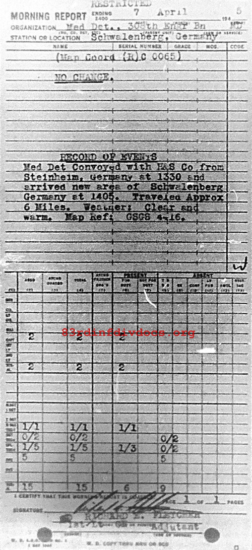 Med Det convoyed with H&S Co from Steinheim, Germany at 1330 and arrived new area of Schwalenberg, Germany at 1405. Traveled approx: 6 miles. Weather: Clear and warm.