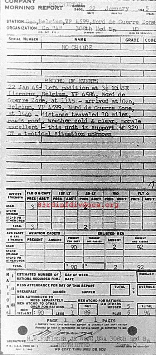 Left position at 3 1/2 Mi SE Lierneux, Belgium, vP6586, at 1145. Arrived at Ozo, Belgium, vP4599, at 1440. Distance traveled: 30 miles. Roads: Good. Weather: Cold and clear. Morale: Excellent. This unit in support of 329th CT. Tactical situation unknown.