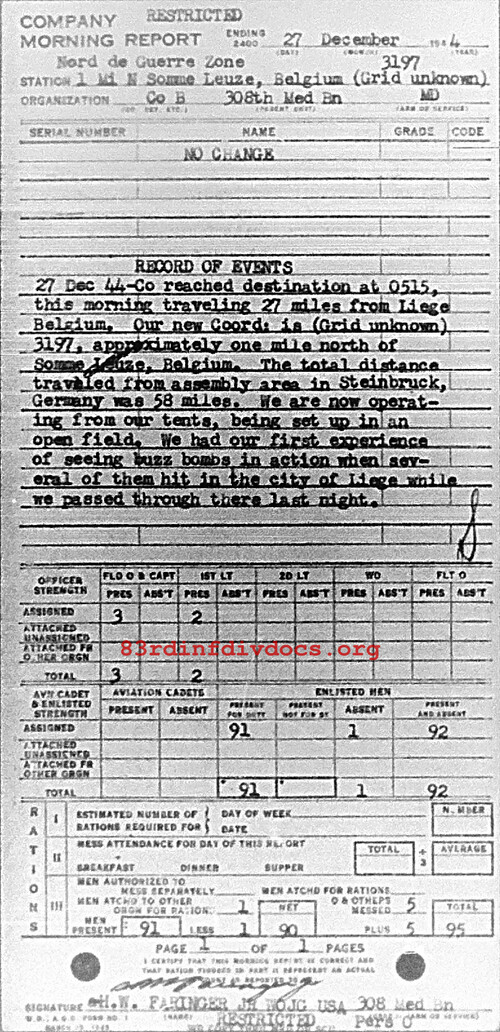 Co reached destination at 0515, this morning traveling 27 miles Liege, Belgium. Our new coord is vP3197, approximately one mile north of Somme Leuze, Belgium. The total distance traveled from assembly area in Steinbruck, Germany was 58 miles. We are now operating from our tents, being set up in an open field. We had our first experience of seeing buzz bombs in action when several of them hit in the city of Liege while we passed through there last night.