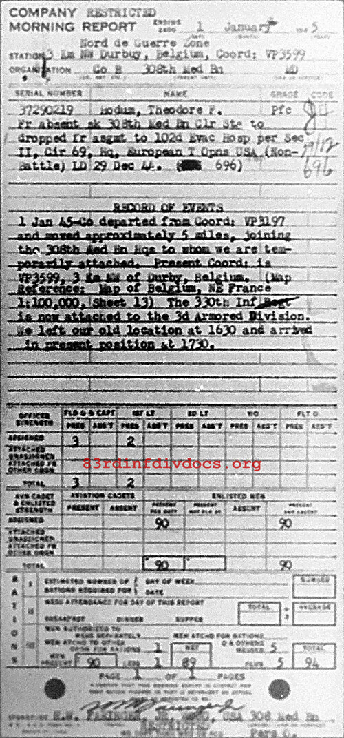 Departed from coord: vP3197 and moved approximately 5 miles, joining the 308th Med Bn Hqs to whom we are temporarily attached. Present coord is vP3599, 3 Km NW of Durby, Belgium. The 330th Inf Regt is now attached to the 3d Armored Division. We left our old location at 1630 and arrived in present position at 1730.