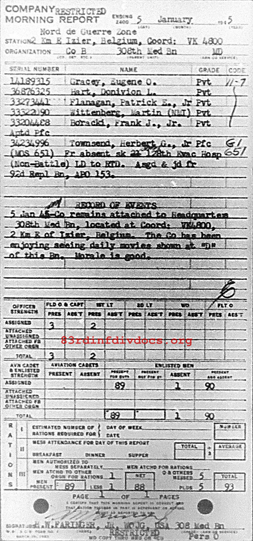 Co remains attached to Headquarters 308th Med Bn, located at coord: vK4800, 2 Km E of Izier, Belgium. The Co has been enjoying seeing daily movies shown at 'D' of this Bn. Morale is good.