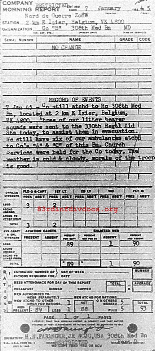 Co still attached to Hq 308th Med Bn, located at 2 Km E Izier, Belgium, vK4800. Three of our litter bearer squads were sent to the 330th Regtl Aid Station today, to assist them in evacuation. We still have six of our ambulances attached to Co's 'A' and 'C' of this Bn. Church services were held for the Co today. The weather is cold and cloudy. Morale of the troops: Good.