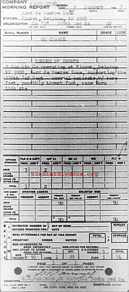 Co operating at Floret, Belgium, vP5993, supporting the 330th Inf Regt. Several patients with sore feet, possibly trench foot, came through this station.