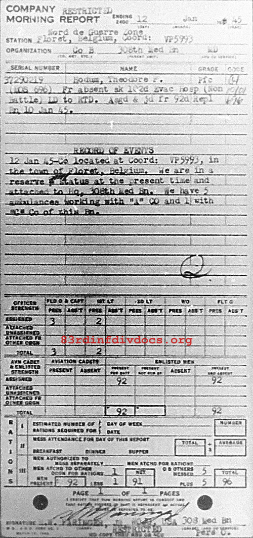 We are in a reserve status at the present time and attached to Hq, 308th Med Bn. We have 5 ambulances working with 'A' Co and 1 with 'C' Co of this Bn.