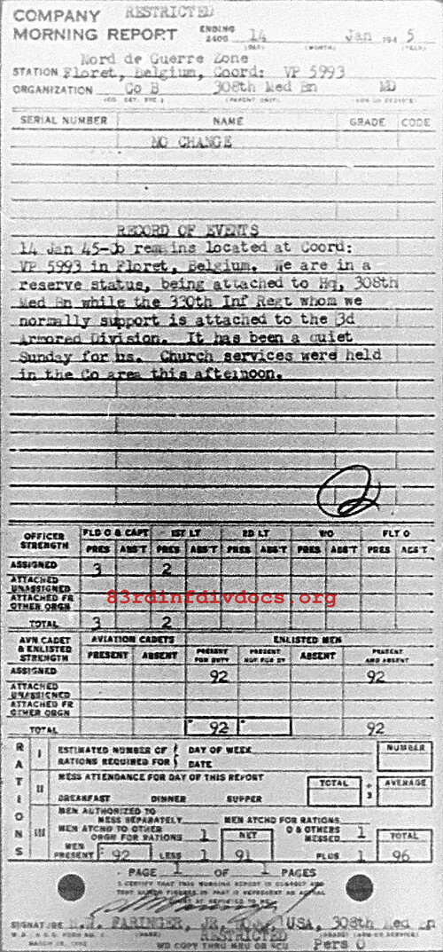 We are in a reserve status, being attached to Hq, 308th Med Bn while the 330th Inf Regt, whom we normally support is attached to the 3d Armored Division. It has been a quiet Sunday for us. Church services were held in the Co area this afternoon.