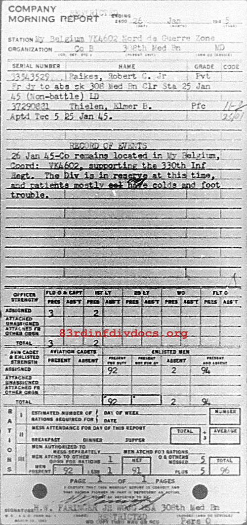 Co remains located in My, Belgium, vK4602, supporting the 330th Inf Regt. The Div is in reserve at this time, and patients mostly have colds and foot trouble.