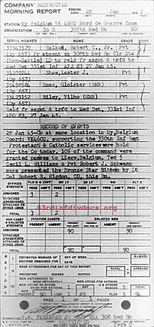Co at same location in My, Belgium, vK4602, supporting the 330th Inf Regt. Protestant and Catholic services were held for the Co today. 10% of the command were granted passes to Liege, Belgium. Tec5 Cecil L. Williams & Pvt Robert J. Schwamp were present the Bronze Star Ribbon by Lt Col Robert S. Higdon, CO, this Bn.