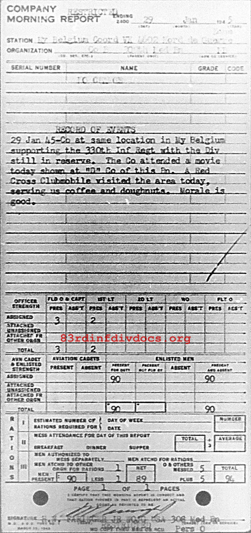 Co at same location in My, Belgium, supporting the 330th Inf Regt with the Div still in reserve. The Co attended a movie today shown at the 'D' Co of this Bn. A Red Cross Clubmobile visited the area today, serving us coffee and doughnuts. Morale is good.