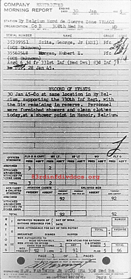 Co at same location in My, Belgium, supporting the 330th Inf Regt, with the Div remaining in reserve. Personnel were furnished showers and clean clothes today, at a shower point in Hamoir, Belgium.