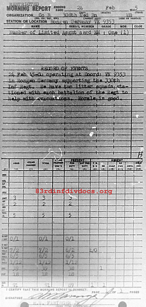 Operating at vK9353 in Hongen, Germany, supporting the 330th Inf Regt. We have two litter squads stationed with each battalion of the Regt to help with evacuations. Morale is good.