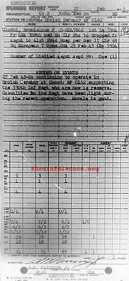 Continuing to operate in Broich Germany at coord wF0162 supporting the 330th Inf Regt who are now in reserve. Casualties in the Regt have been light during the recent operation. Morale is good.