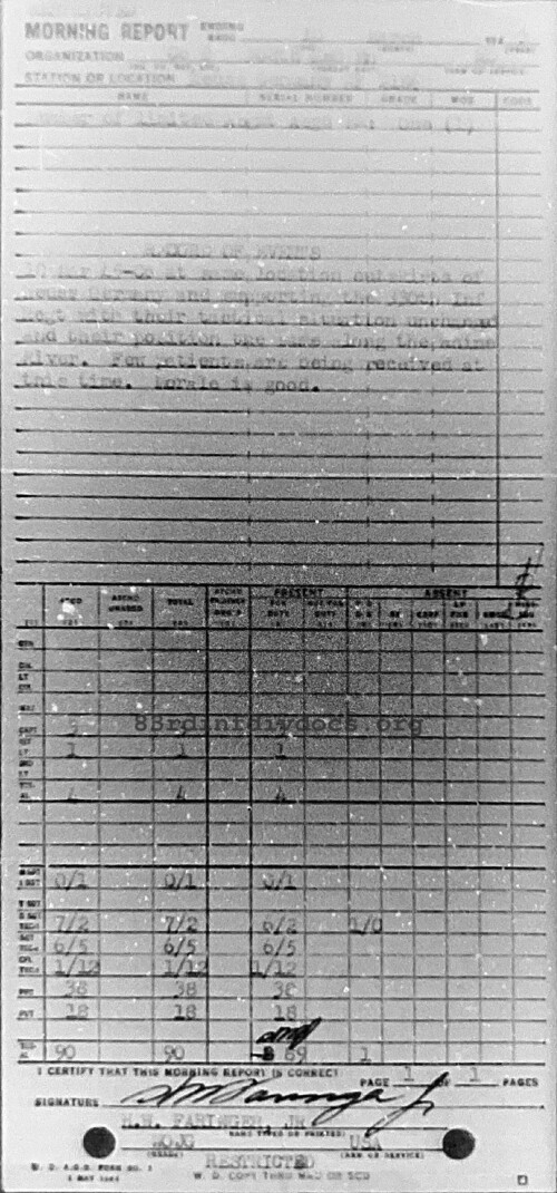 Co at same location outskirts of Neuss, Germany, supporting the 330th Inf Regt and their position the same along the Rhine River. Few patients are being received at this time. Morale is good.