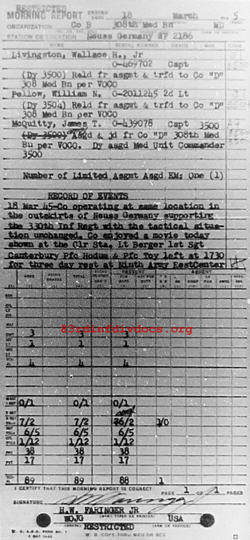 Co at same location in the outskirts of Neuss, Germany supporting the 330th Inf Regt with the tactical situation unchanged. Co enjoyed a movie today shown at the Clearing Station. Lt Berger, 1st Sgt Canterbury, Pfc Hodum and Pfc Toy left at 1730 for three day rest at Ninth Army Rest Center.