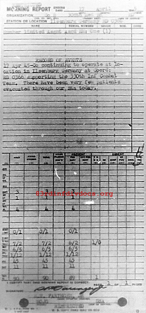 Co continuing to operate at location in Ilsenburg, Germany at rD0366, supporting the 330th Inf Combat Team. There have been very few patients evacuated through our station today.