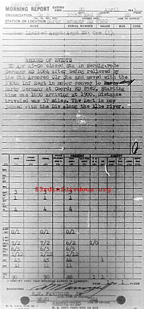 Co closed Sta in Wernigerode, Germany, rD1064 after being relieved by the 8th Armored Clearing Station and moved with the 330th Inf Regt in motor convoy to Barby, Germany at rD8582. Starting time was 1600 arriving at 1900. Distance traveled was 57 miles. The Regt is now joined with the Div along the Elbe river.