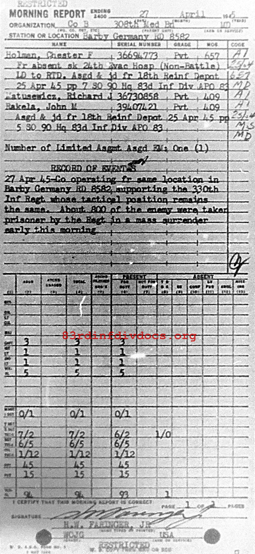 Co operating from same location in Barby, Germany, rD8582 supporting the 330th Inf Regt whose tactical position remains the same. About 800 of the enemy were taken prisoner by the Regt in a mass surrender early this morning.