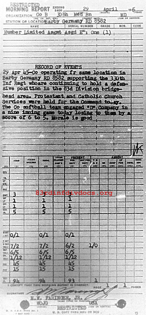 Co operating from same location in Barby, Germany, rD8582 supporting the 330th Inf Regt who are continuing to hold a defensive position in the 83d Division bridgehead area. Protestant and Catholic Church Services were held for the Command today. The Co softball team engaged 'D' Company in a nine inning game today losing to them in a score of 6 to 5. Morale is good.