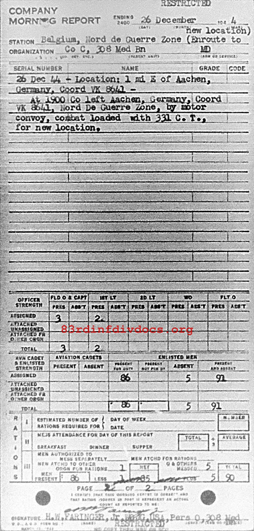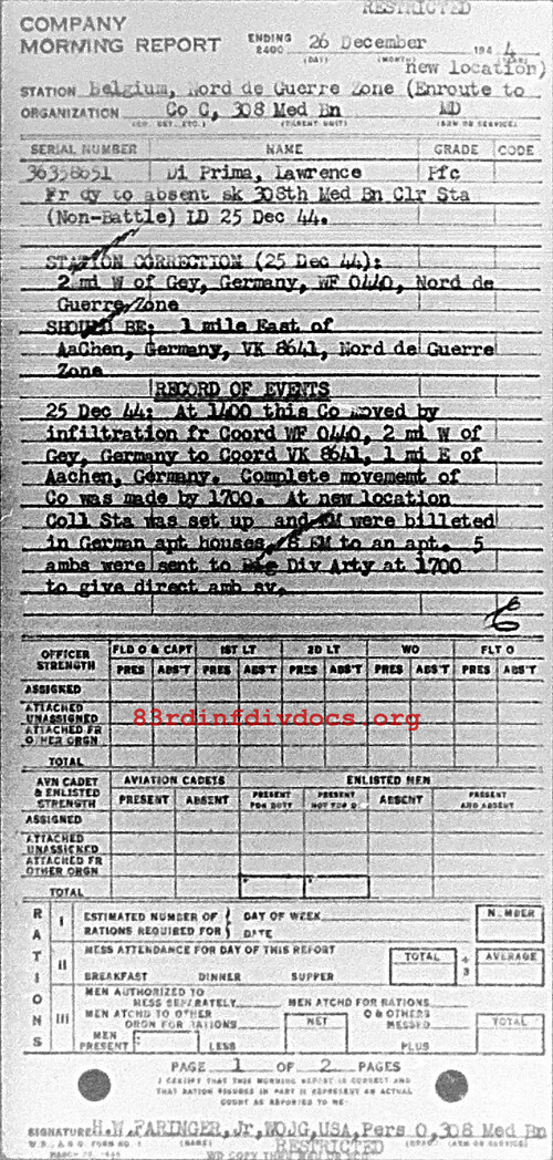 25 Dec 44: At 1400 this Co moved by infiltration from coord wF0440, 2 mi W of Gey, Germany to vK8641, 1 mi E of Aachen, Germany. Complete movement of Co was made by 1700. At new location Collection Station was set up and EM were billeted in Germant apt houses. 8 EM to an apt. 5 ambulances were sent to Div Art at 1700 to give ambulance service. 26 Dec 44: At 1900 Co left Aachen, Germany, vK8641, by motor convoy combat loaded with 331 Combat Team, for new location.