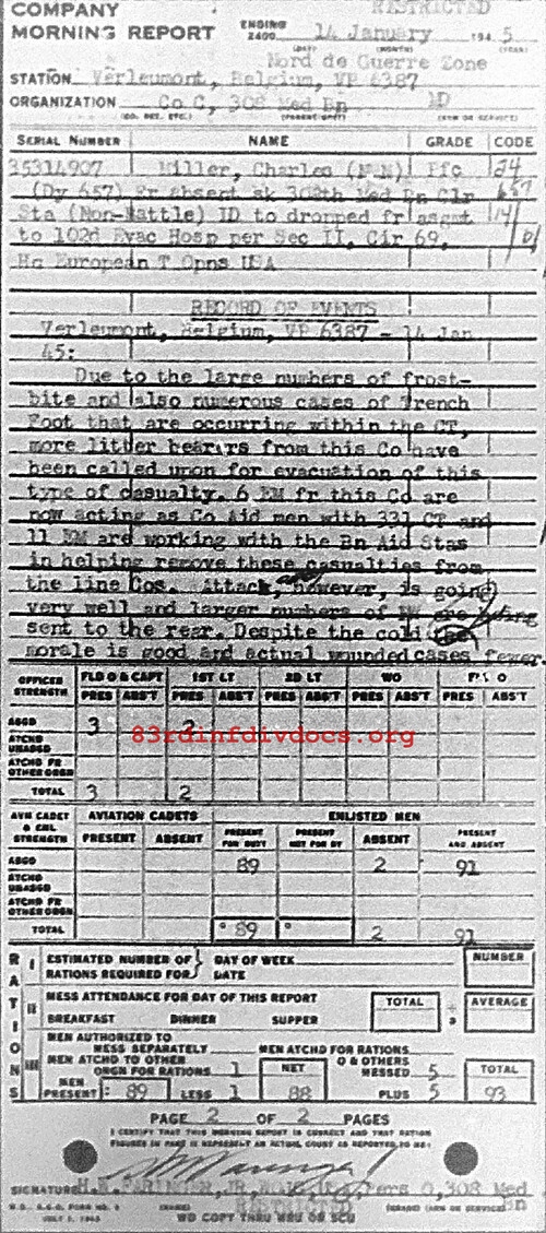 Due to the large numbers of frostbite and also numerous cases of Trench Foot that are occuring within the CT, more litter bearers from this Co have been called upon for evacuation of this type of casualty. 6 EM from this Co are now acting as Co Aid men with 331 CT and 11 EM are working with the Bn Aid Station in helping remove these casualties from the line Cos. Attack, however, is going very well and large numbers of EM are being sent to the rear. Despite the cold, the morale is good and actual wounded cases fewer.