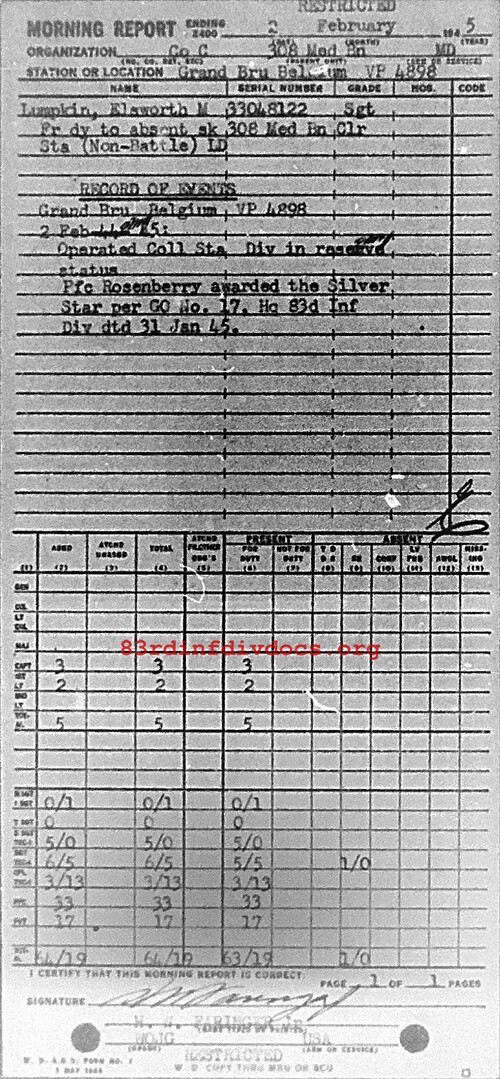 Operated Collection Station. Division in reserve status. Pfc Rosenberry awarded the Silver Star per GO No. 17, Hq 83d Inf Div dtd 31 Jan 45.