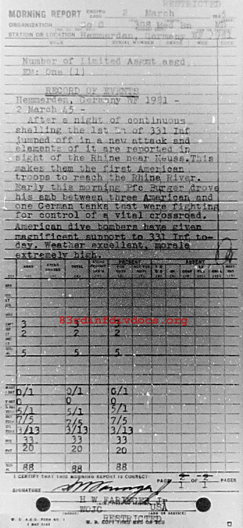 After a night of continuous shelling in the 1st Bn of 331 Inf jumped off in a new attack and elements of it are reported in sight of the Rhine near Neuss. This makes them the first American troops to reach the Rhine River. Early this morning Pfc Burger drove his amb between three American and one German tanks that were fighting for control of a vital crossroad. American dive bombers have given magnificient support to 331 Inf today. Weather: Excellent. Morale: Extremely high.