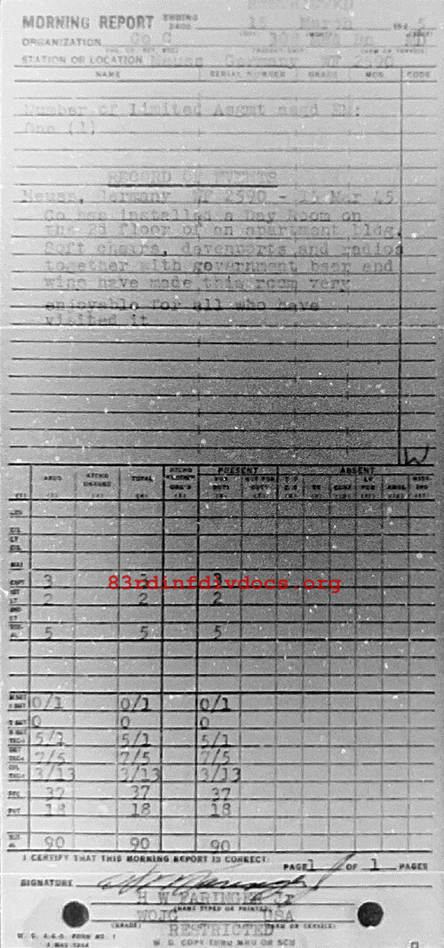 Co has installed a Day Room on the 2d floor of an appartment bldg. Soft chairs, davenports and radios together with goveernment beer and wine have made this room very enjoyable for all who have visited it.